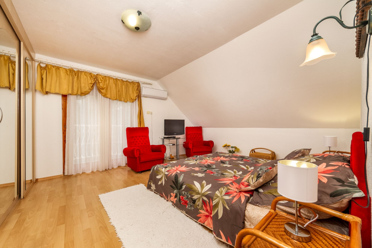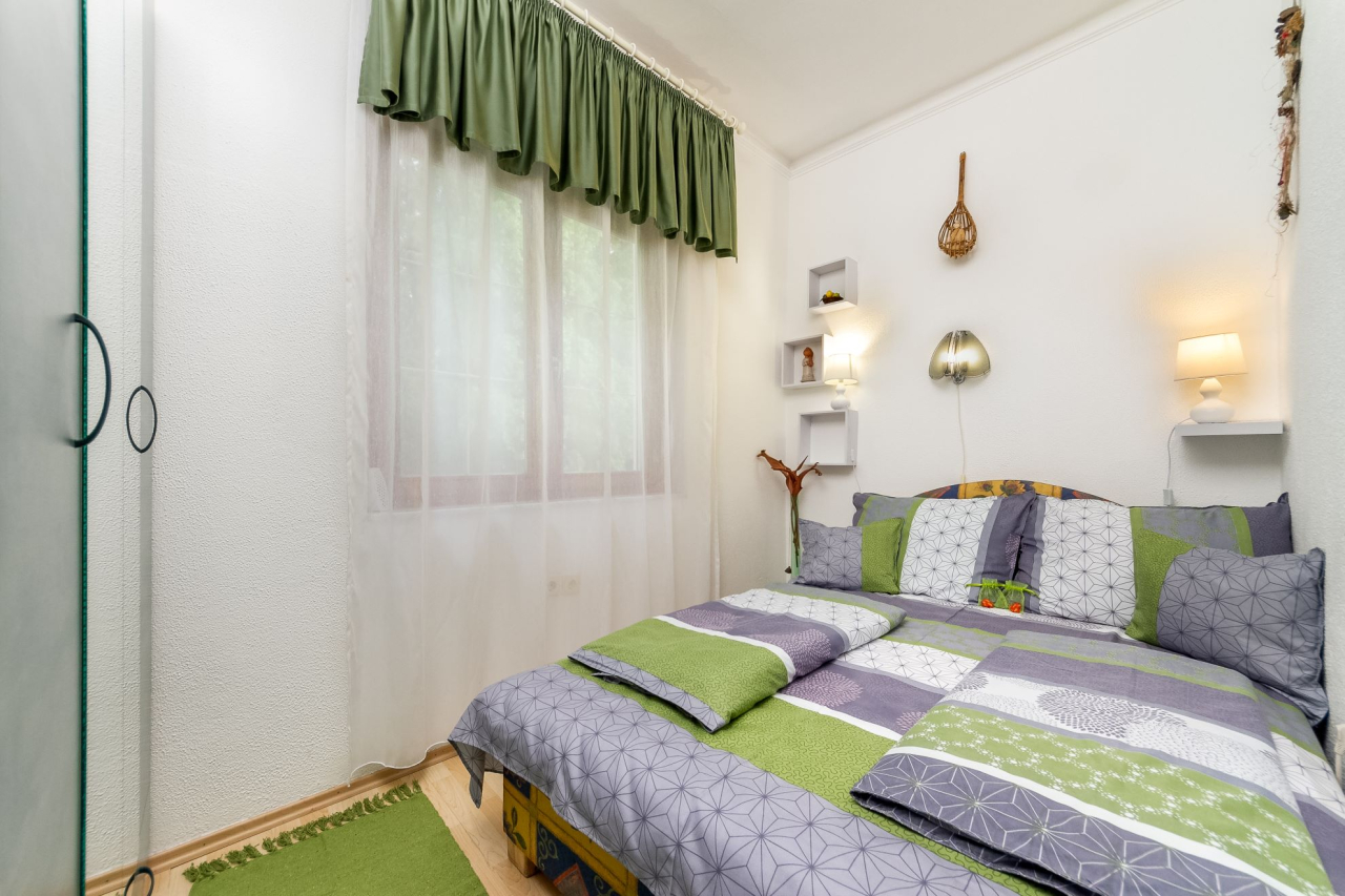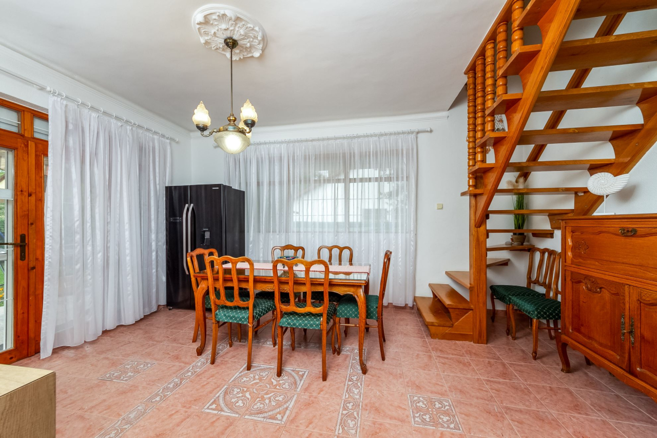 Alleinstehendes Ferienhaus für 8 Personen mit Waschmaschine in einem schön gepflegten Garten. Gartenmöbel, Gartengrill, Sonnenliegen, Hollywood- Schaukel, SAT-TV, Autoabstellplatz sind vorhanden.