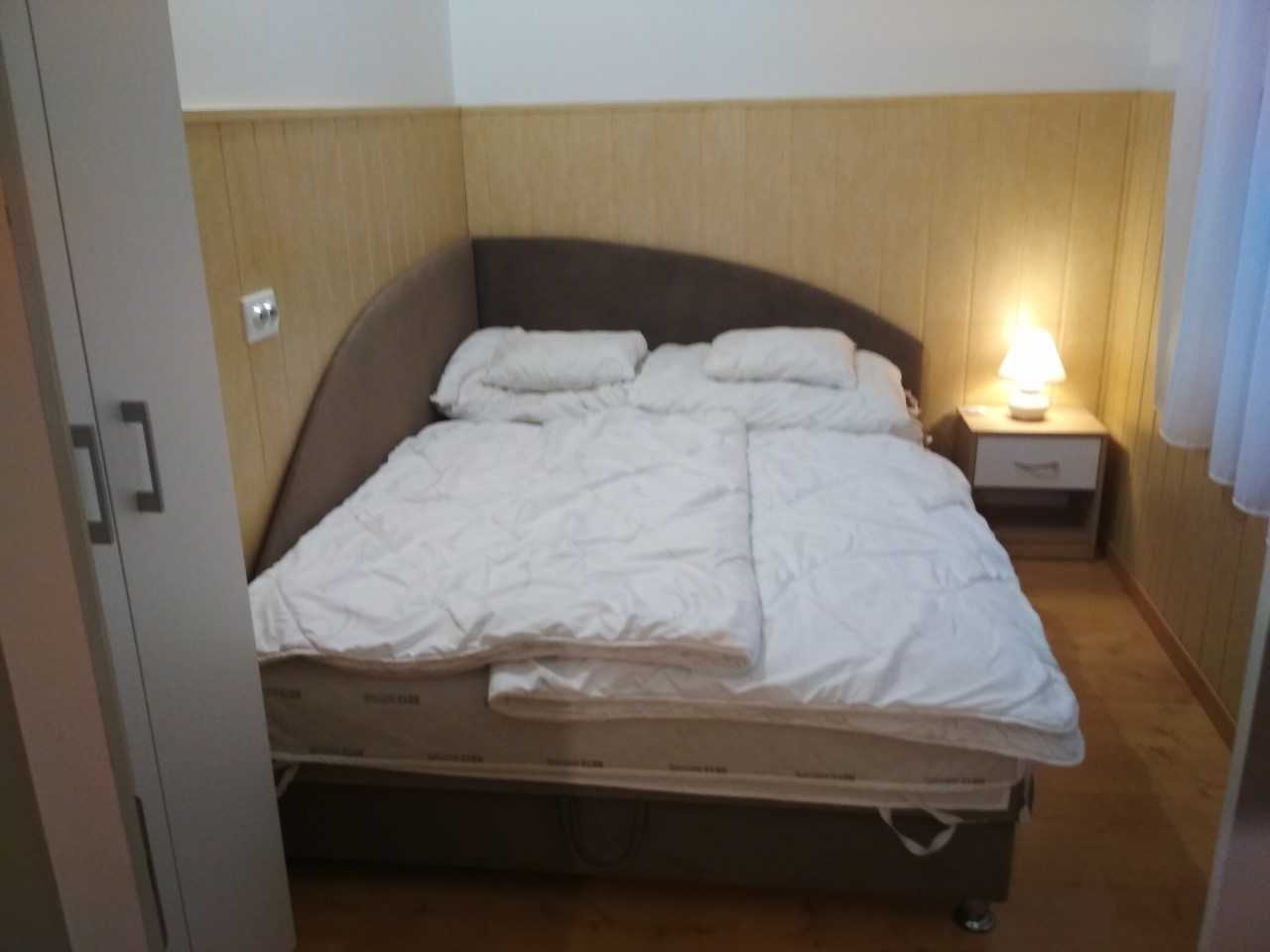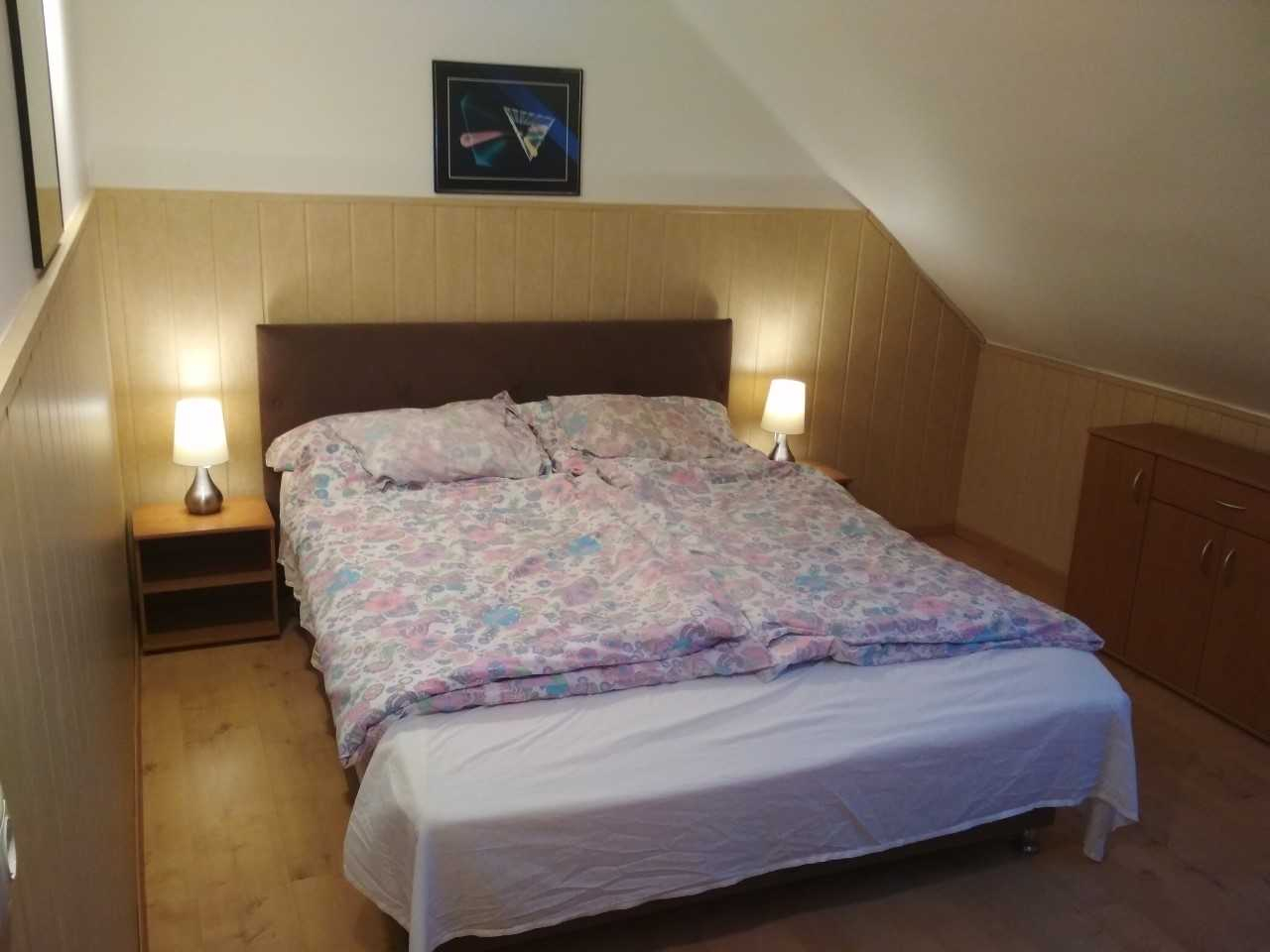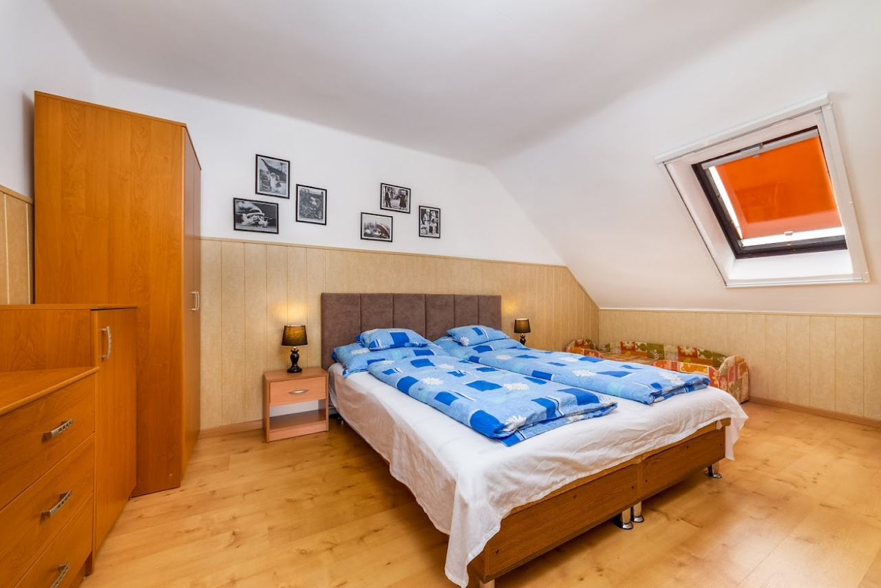 OG: Wohnzimmer, zwei Zweibettzimmer, Bad, WC, Balkon.
