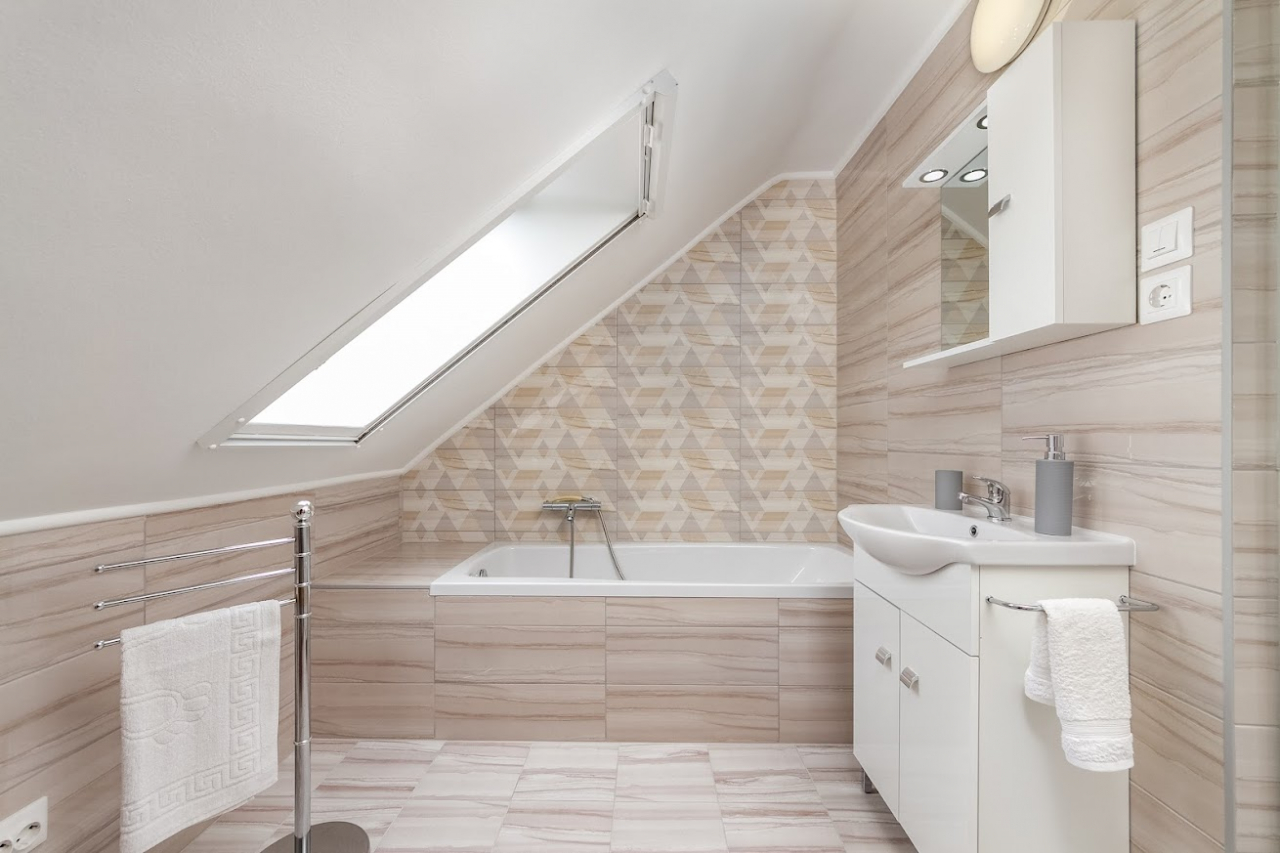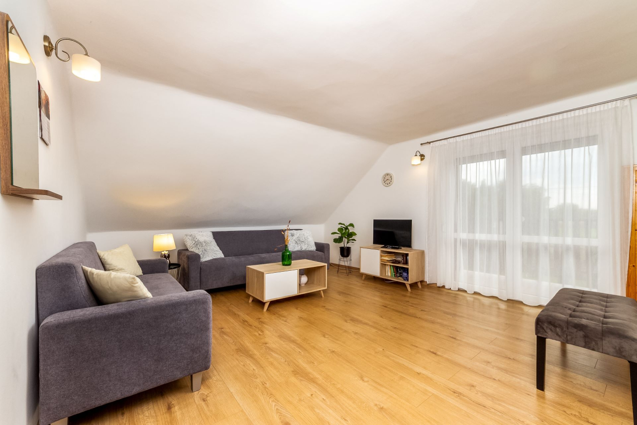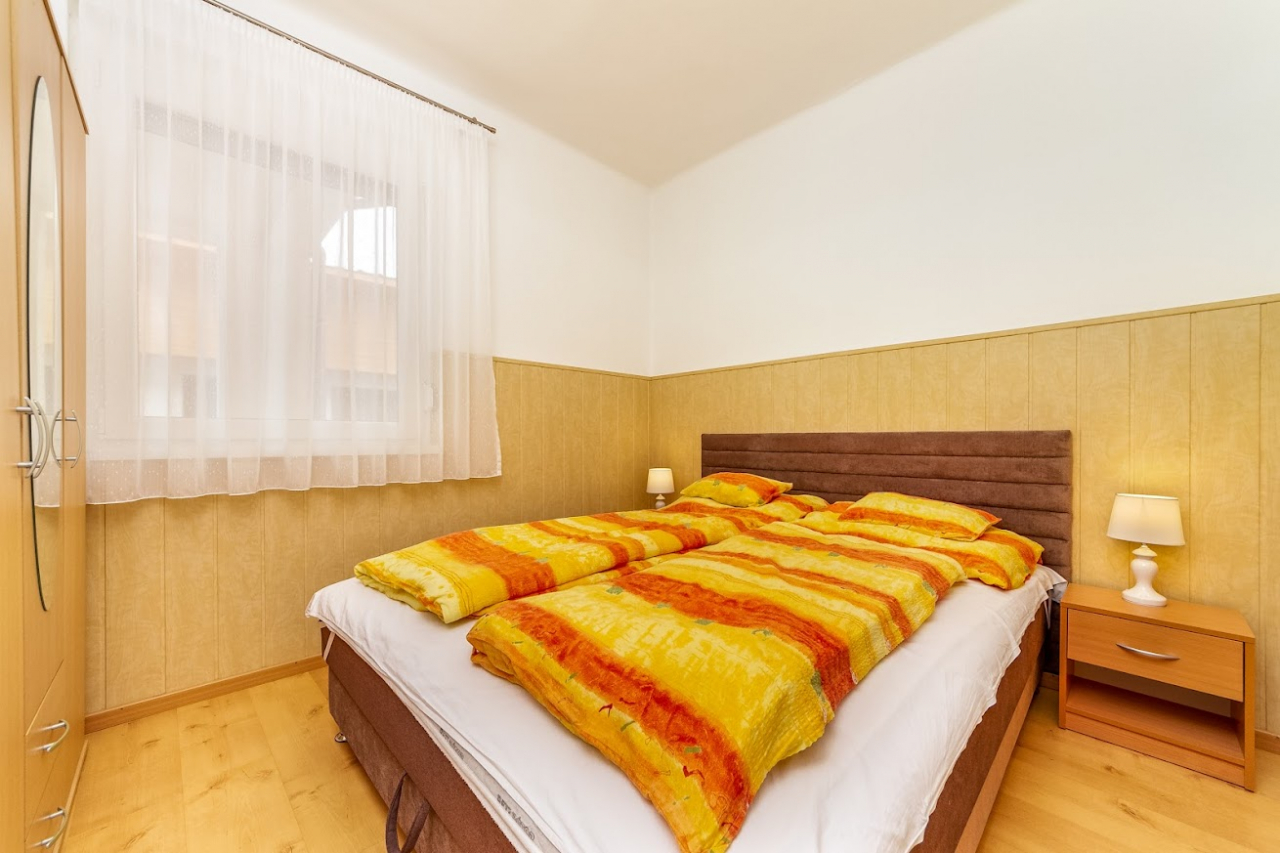 OG: Wohnzimmer, zwei Zweibettzimmer, Bad, WC, Balkon.