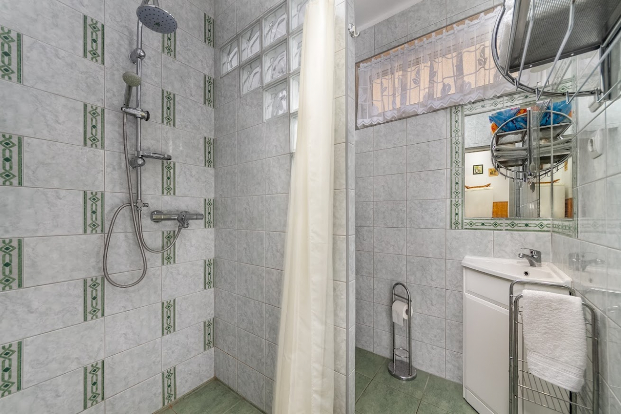 EG: Wohn-Eßzimmer, Kochecke, Dusche/WC, zwei Zweibettzimmer, Terrasse überdacht.