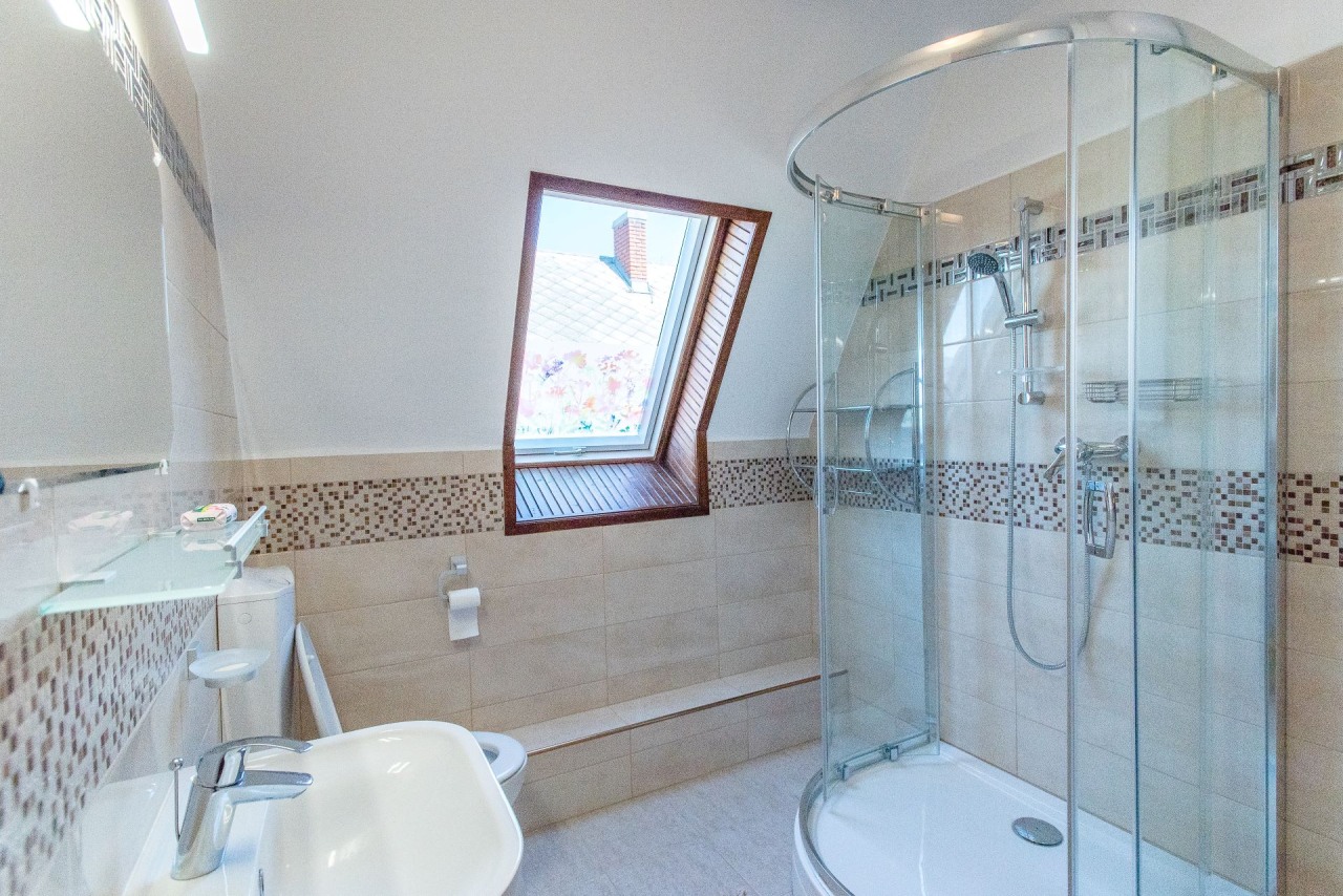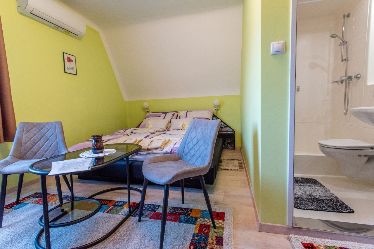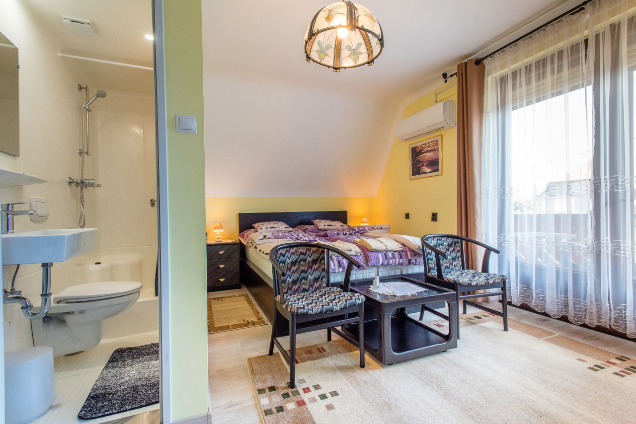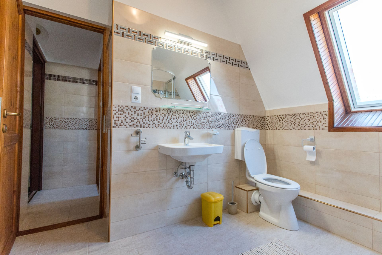 OG: Eßzimmer, Küche, zwei Zweibettzimmer, ein Zweibettzimmer mit Dusche/WC, ein Zweibettzimmer mit Dusche/WC und Balkon, ein Zweibettzimmer mit Balkon, 2 Dusche/WC