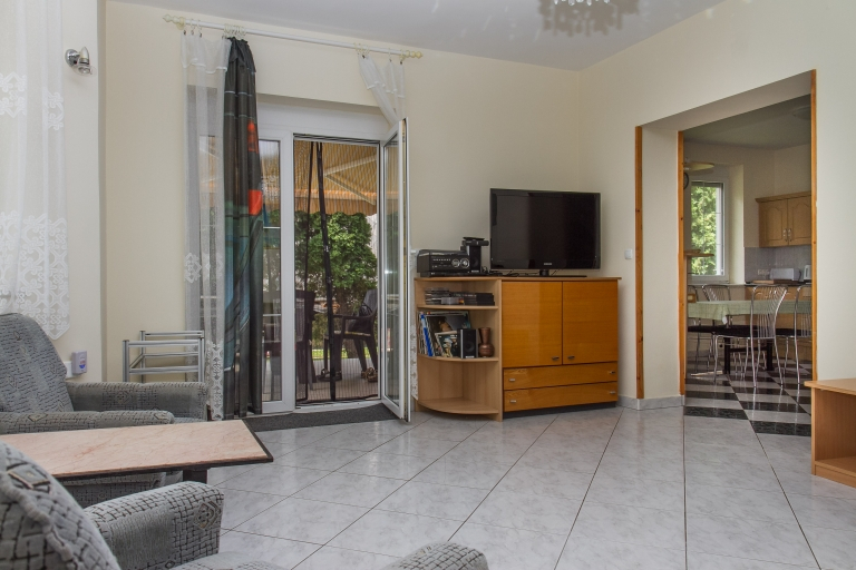 EG: Großes Wohnzimmer, Küche, Dusche/WC, Terrasse.