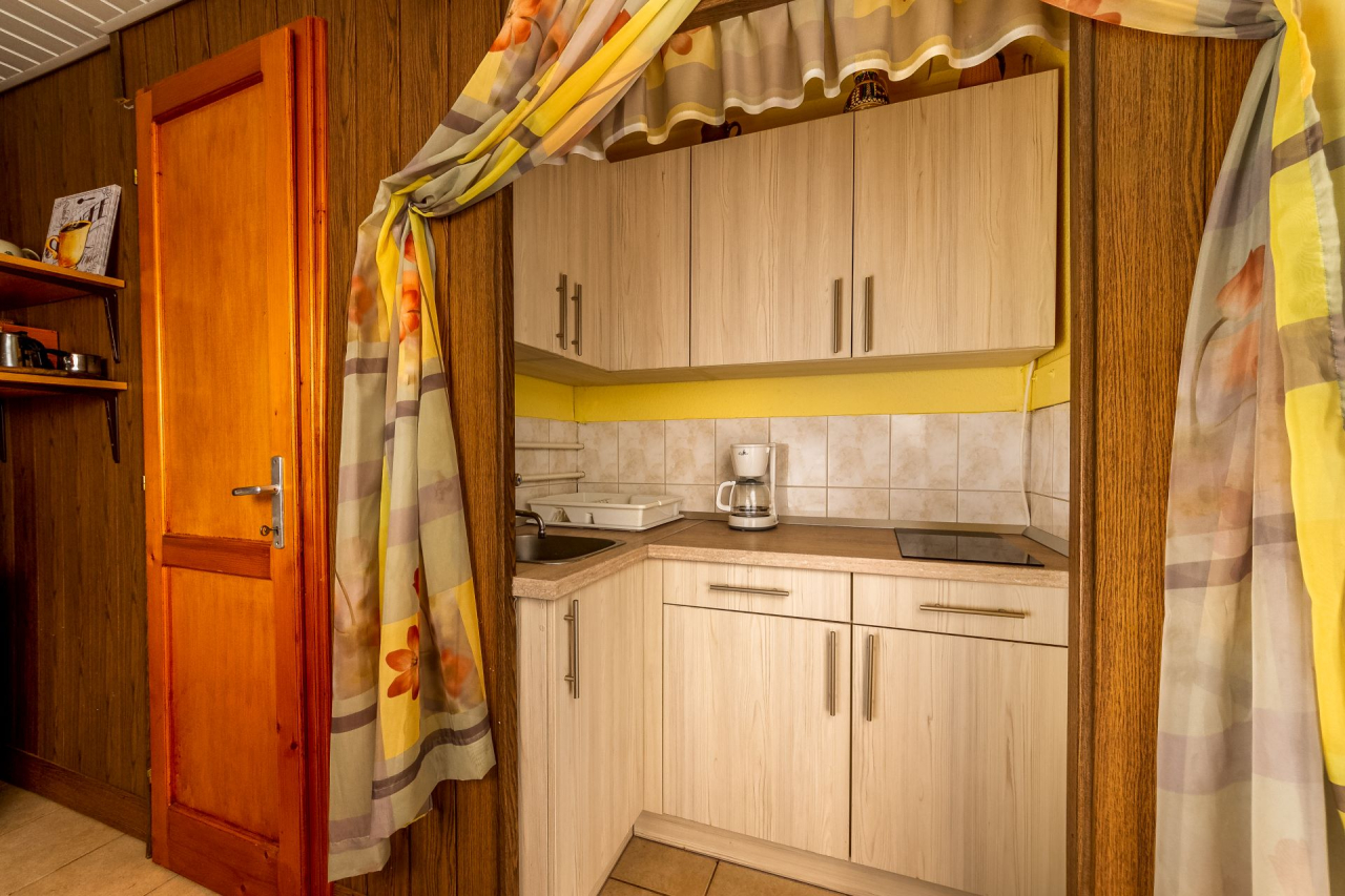 EG: Wohnzimmer mit Koch- und Eßecke, zwei Zweibettzimmer, Dusche/WC, Terrasse überdacht.